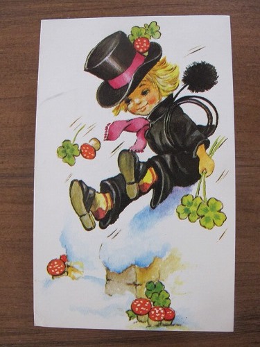 旧西ドイツ製1950〜1960年代頃のポストカードです。(New Year キノコ 四つ葉) 横幅が細めのポストカードです。