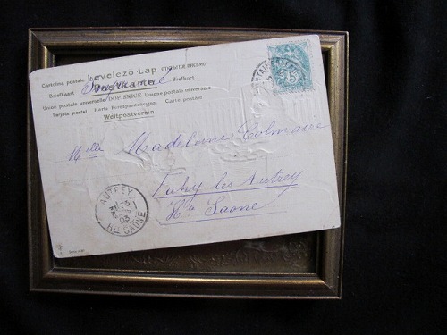 フランス切手1903年消印のアンティークポストカードです。エンボス加工。絵柄面には金彩も施されています。