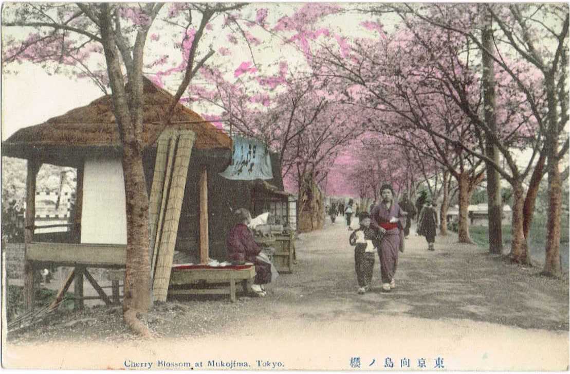 手彩色絵葉書 東京向島の桜 茶屋 [j633]