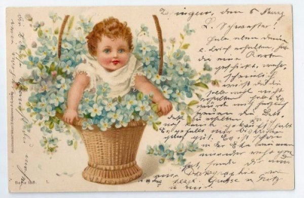 Postcard 忘れな草のお花のバスケットと赤ちゃん [g5342]