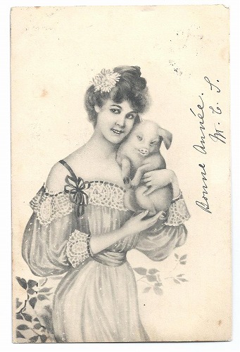 Postcard 子豚を抱く女性 ウィーン趣味風 1906年