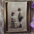 Postcard テディベアを抱く女の子と花束を持つ男の子 Steiff ? [c4790]