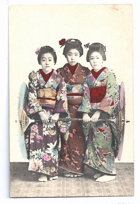 手彩色絵葉書 着物姿の少女たち 3人 和傘 1909年