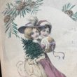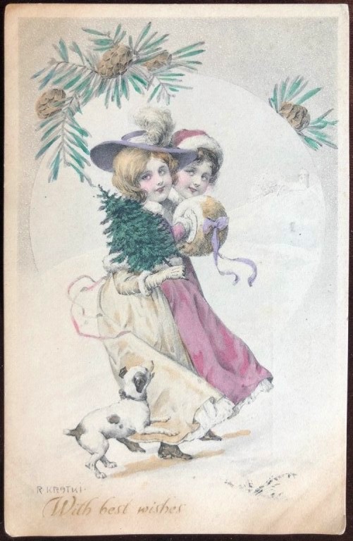 Postcard ウィーン趣味 クリスマスツリーを持つ女の子と子犬 R.Kratki