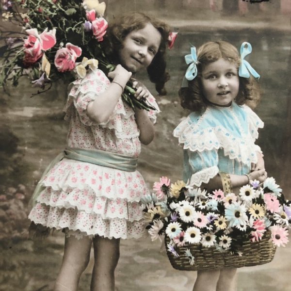 Postcard お花籠と女の子 パニエ フランス1909年