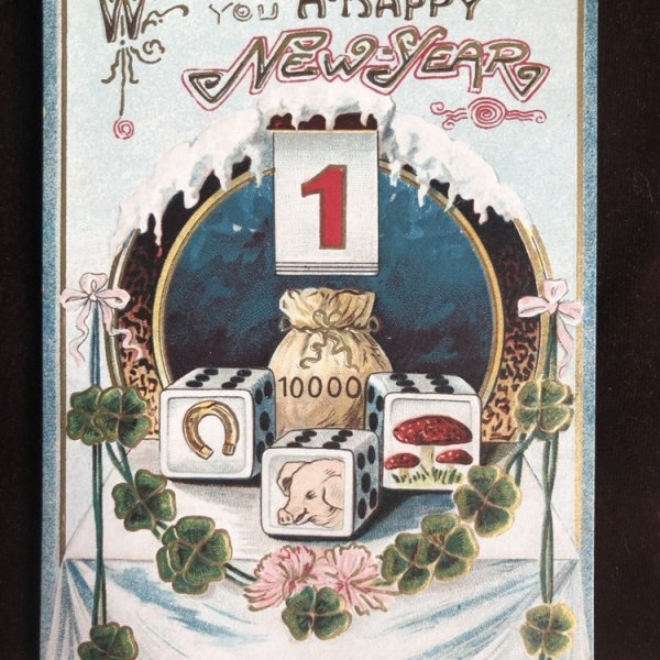 Postcard 新年祝い New Year ラッキーチャームのサイコロ 豚 馬蹄 キノコ