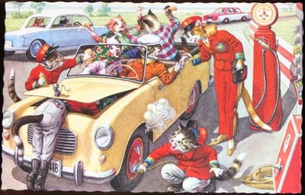 Postcard ガソリンスタンドでの猫たち Mainzer cat [n4631]