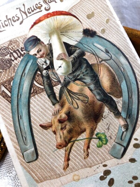 Postcard 新年祝い New Year 大きなキノコを持ち豚に乗る煙突掃除夫さん 馬蹄 金貨 四葉