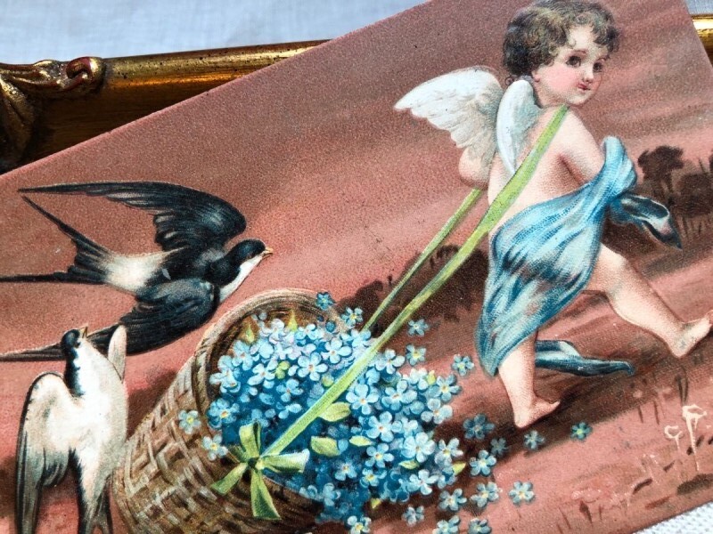 Postcard アンティークポストカード ツバメと忘れな草のお花を運ぶ天使 Ellen Clapsaddle フランス1907年
