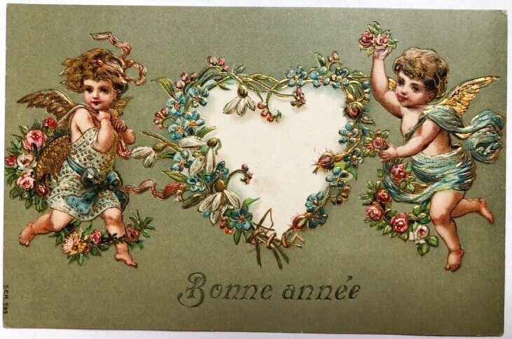 Postcard アンティークポストカード ハートのリースと天使たち フランス1908年