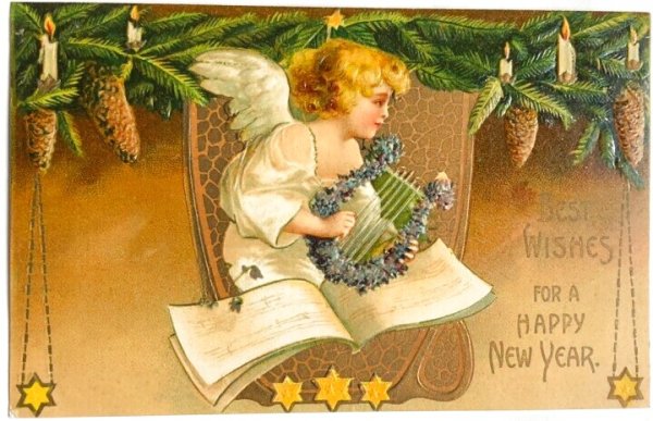 Postcard アンティークポストカード 新年祝い Happy New Year 天使と竪琴 キャンドル Ellen Clapsaddle
