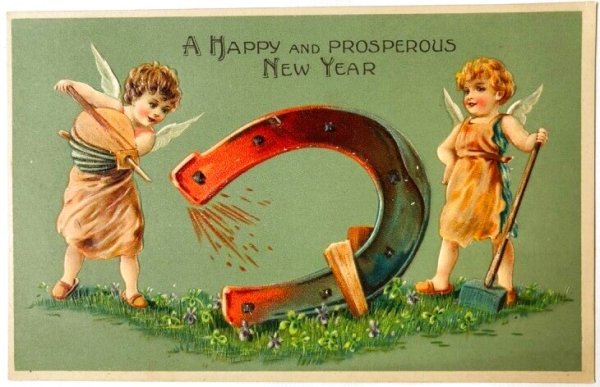 Postcard アンティークポストカード 新年祝い New Year 大きな馬蹄と天使
