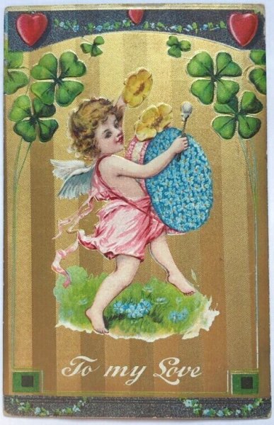 Postcard アンティークポストカード バレンタイン 天使とお花の楽器 忘れな草のお花のドラム アメリカ1910年