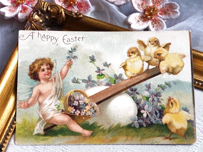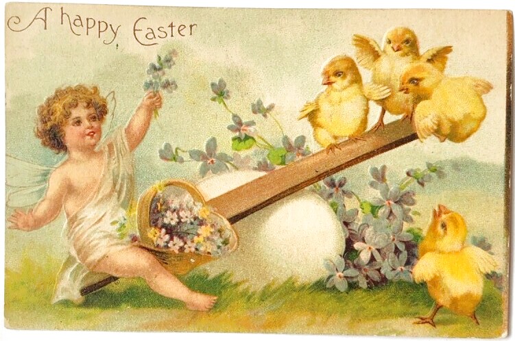 Postcard アンティークポストカード イースター シーソー遊びをする天使とヒヨコ スミレ Ellen Clapsaddle