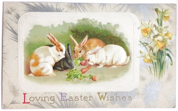 Postcard アンティークポストカード イースター うさぎさんと人参 ウサギ ラッパ水仙 Ellen Clapsaddle [g9343]
