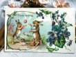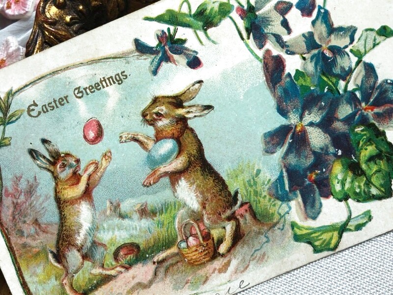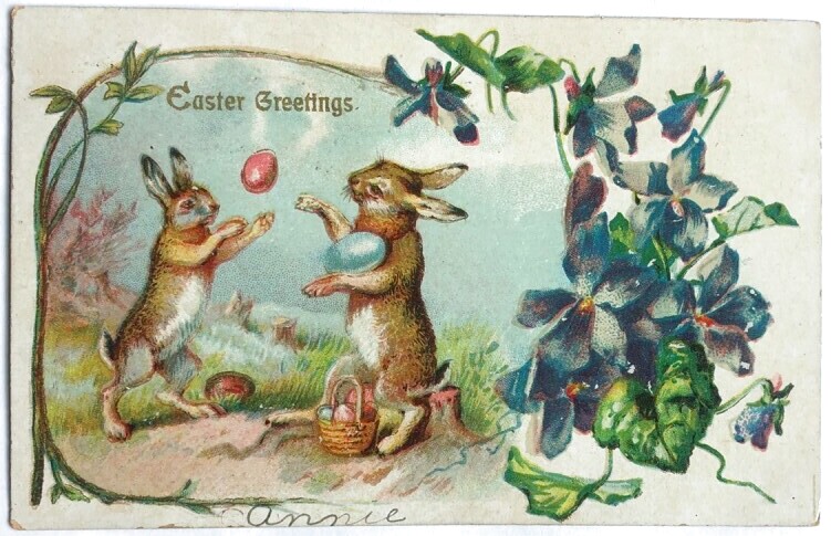 Postcard アンティークポストカード イースター 卵を投げるウサギさん うさぎ スミレ アメリカ1907年