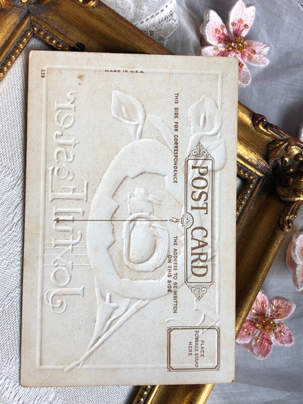 Postcard アンティークポストカード イースター 白いお花とウサギさん うさぎ カラー (未使用)