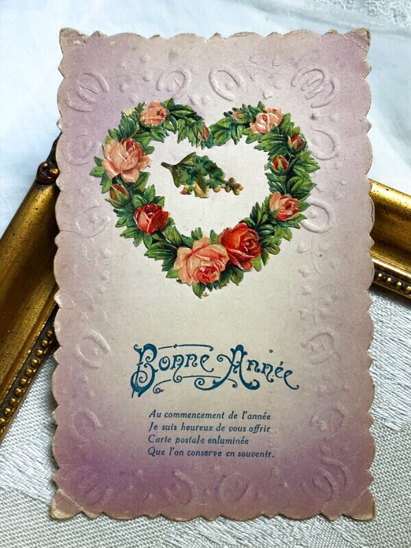 Postcard アンティークポストカード 薔薇のお花 ハートのリース フランス