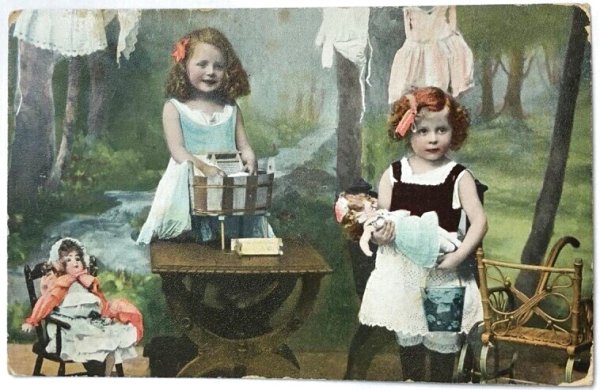 Postcard アンティークポストカード お人形さんとお洗濯をする女の子たち ドイツ1906年