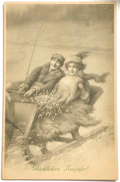 Postcard アンティークポストカード クリスマス ヤドリギ ソリに乗る2人 M.M.VIENNE ドイツ1913年