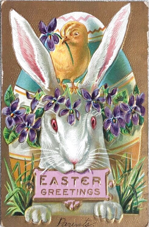 Postcard アンティークポストカード イースター ウサギとヒヨコ スミレ