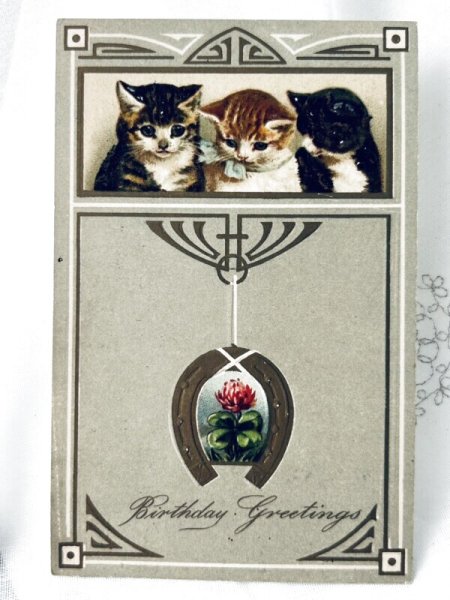 Postcard アンティークポストカード 3匹の猫と馬蹄 アカツメクサ Helena Maguire