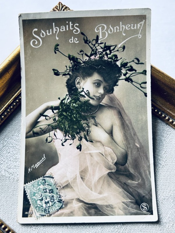Postcard アンティークポストカード クリスマス ヤドリギと女性 フランス1907年