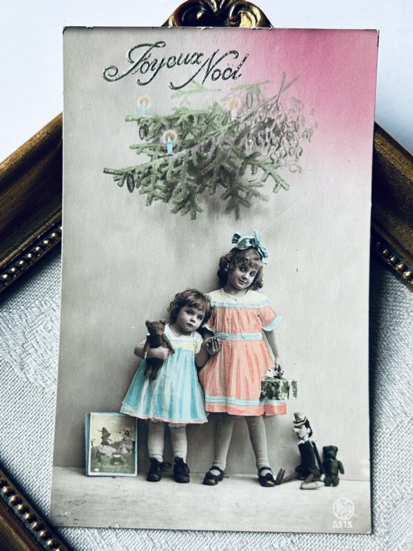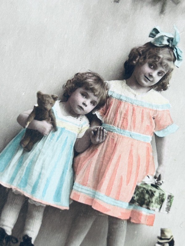 Postcard アンティークポストカード クリスマス テディベアとお人形と女の子