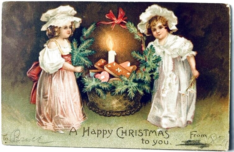 Postcard アンティークポストカード クリスマス 大きなバスケットと女の子 Ellen Clapsaddle ?