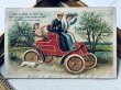 Postcard アンティークポストカード バレンタイン 自動車に乗る恋人たちとキューピッド天使 犬