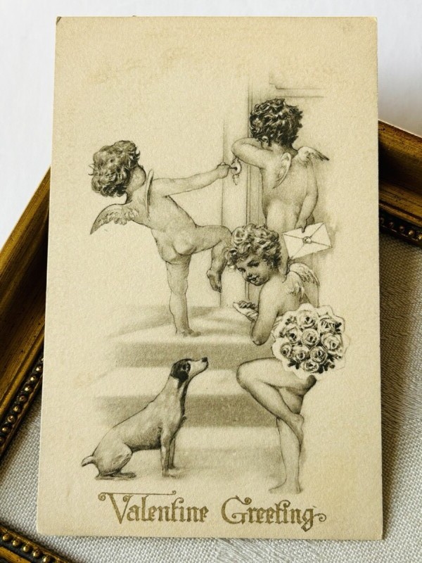 Postcard アンティークポストカード バレンタイン ドアを開けるキューピッド天使とテリア犬