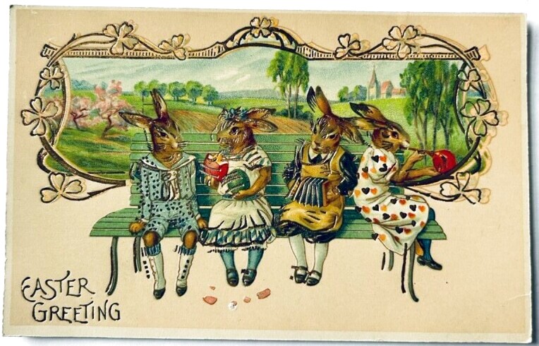 Postcard アンティークポストカード イースター ベンチに座る子ウサギたち イースターエッグ アコーディオン (未使用)