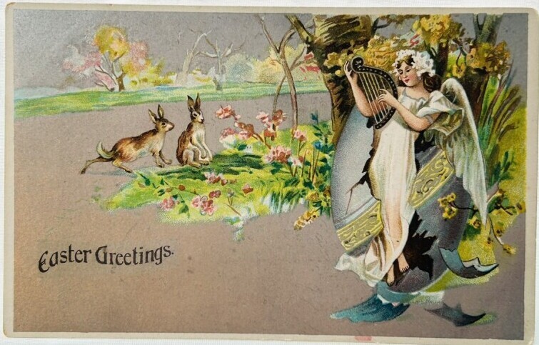 Postcard アンティークポストカード イースター ハープを引く天使を見ているウサギ
