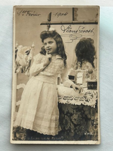 Postcard アンティークポストカード 化粧台前の女の子 香水瓶 レース フランス