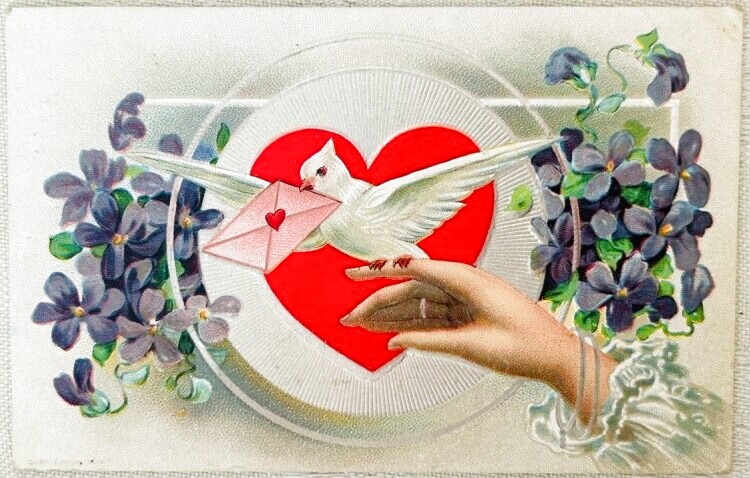 Postcard アンティークポストカード 手とお花 白鳩 手紙 スミレ