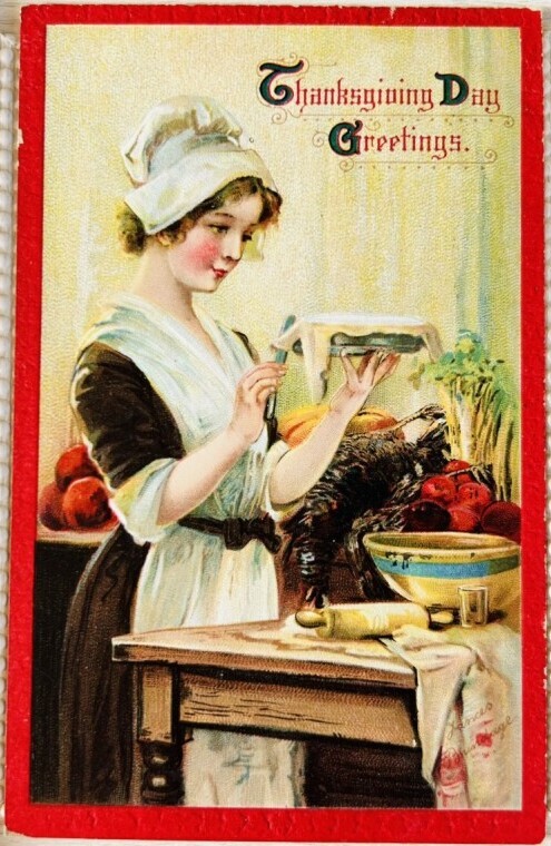 Postcard アンティークポストカード サンクスギビング 感謝祭 アップルパイを作る女性 Ellen Clapsaddle