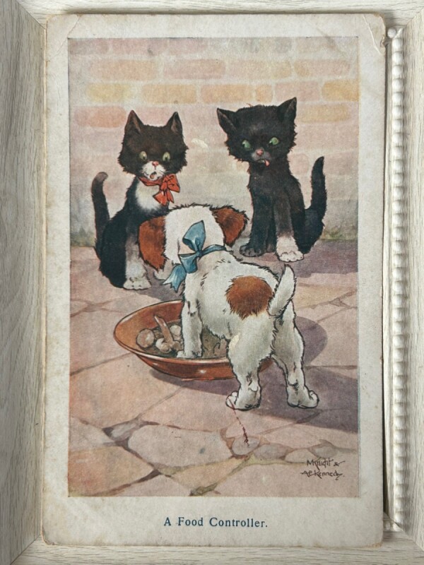 Postcard アンティークポストカード フードを守る犬を見ている黒猫 Mcnight & A.E.Kennedy