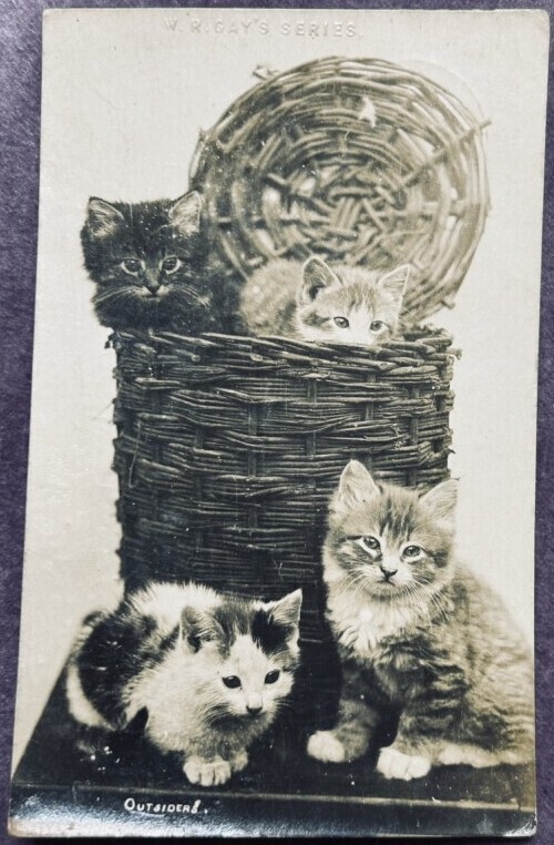 Postcard アンティークポストカード バスケットと4匹の子猫 イギリス1920年