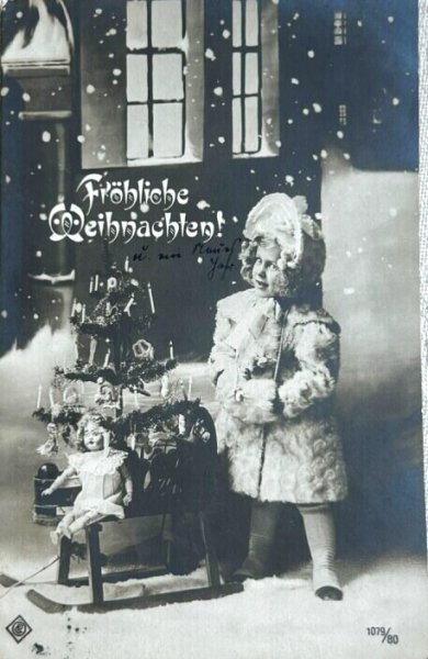 Postcard アンティークポストカード クリスマス お人形とツリーをソリで運ぶ女の子 写真 ドイツ1908年