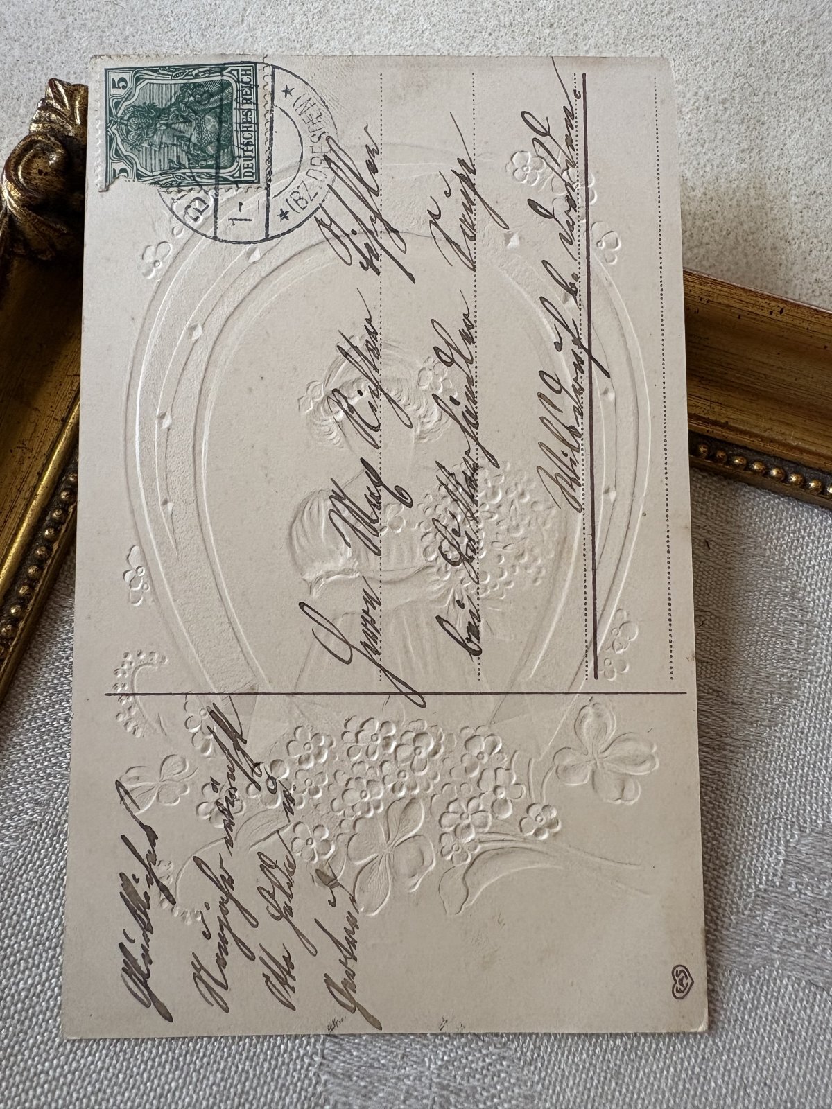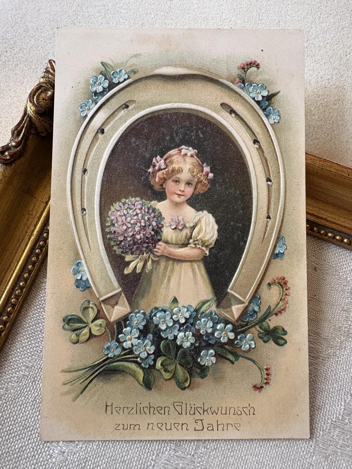 Postcard アンティークポストカード 忘れな草のお花と女の子 馬蹄 四つ葉 ドイツ1914年