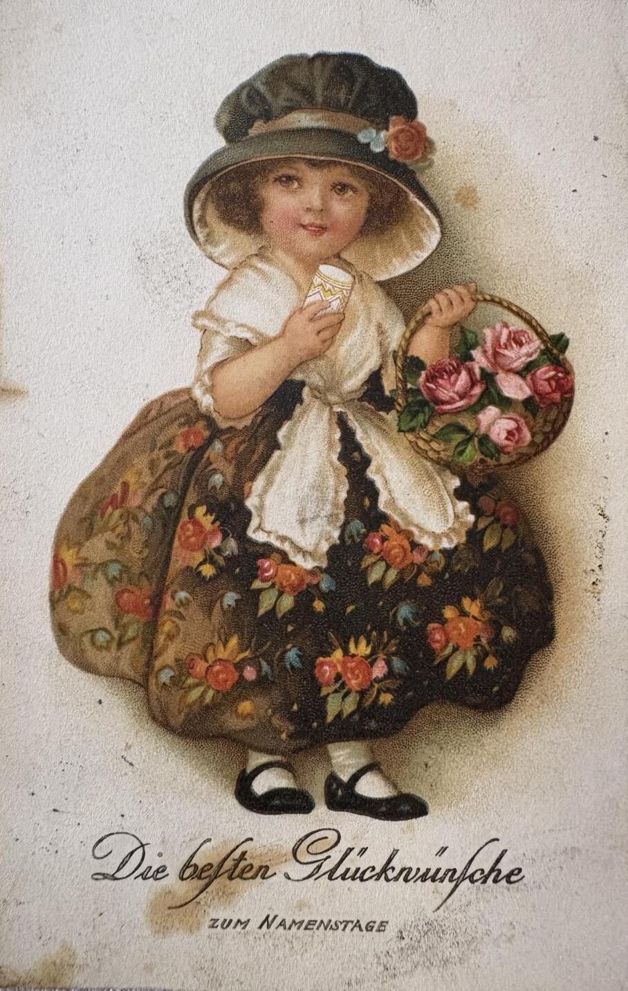 Postcard アンティークポストカード 薔薇のお花かご(パニエ)と女の子 Ellen Clapsaddle