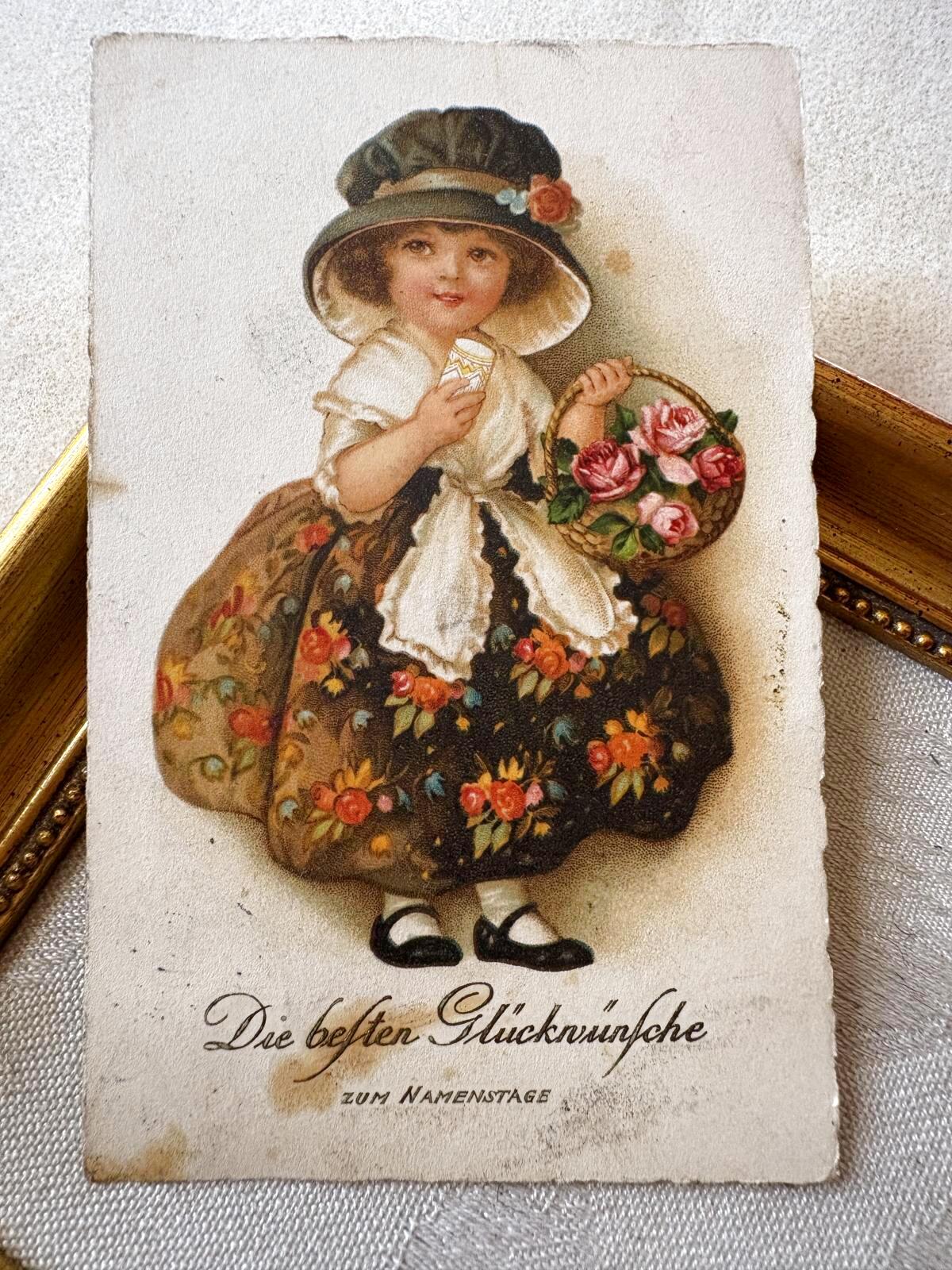 Postcard アンティークポストカード 薔薇のお花かご(パニエ)と女の子 Ellen Clapsaddle [g12126]