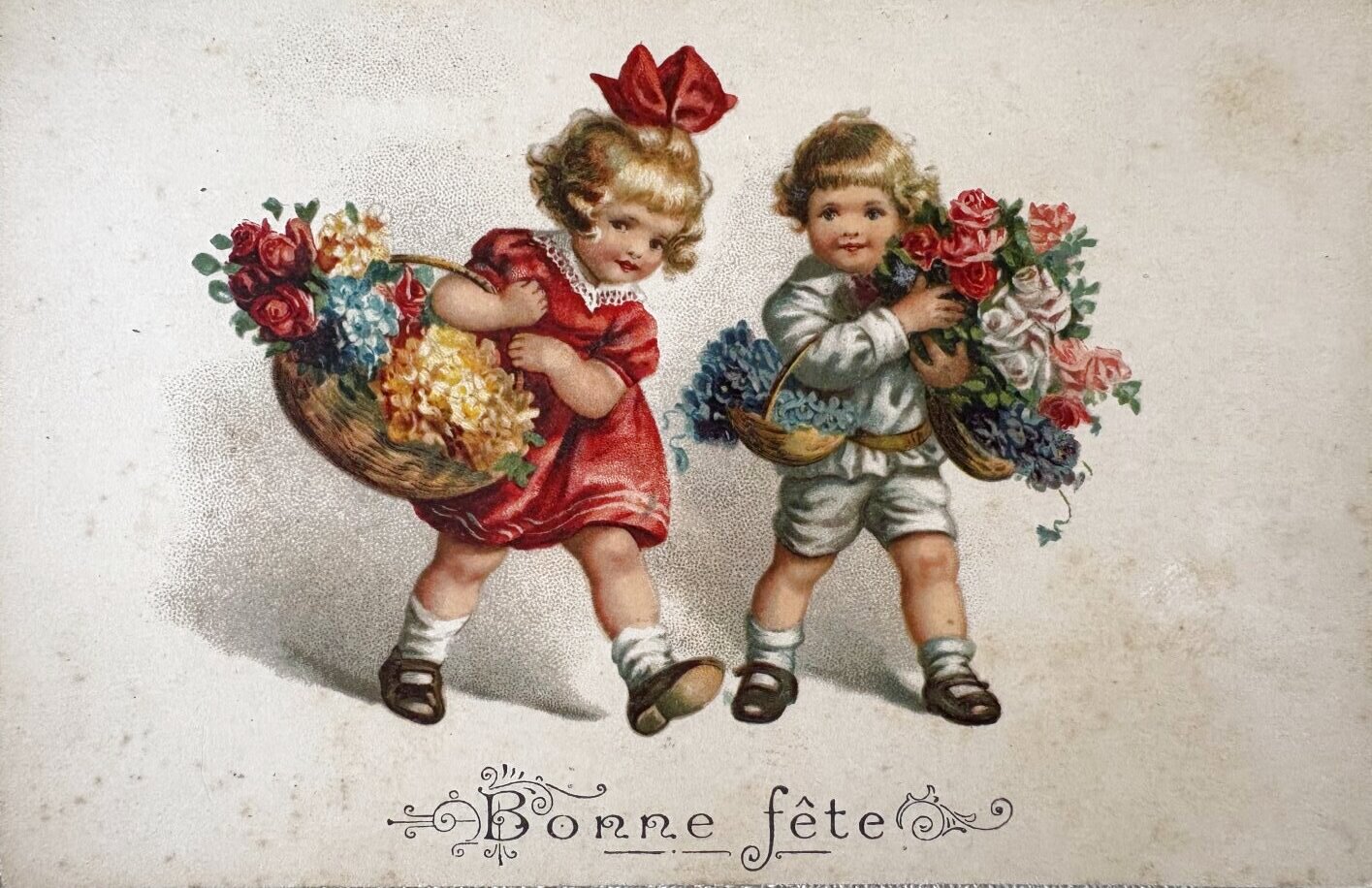 Postcard アンティークポストカード お花かご(パニエ)と子どもたち Wally Fialkowska