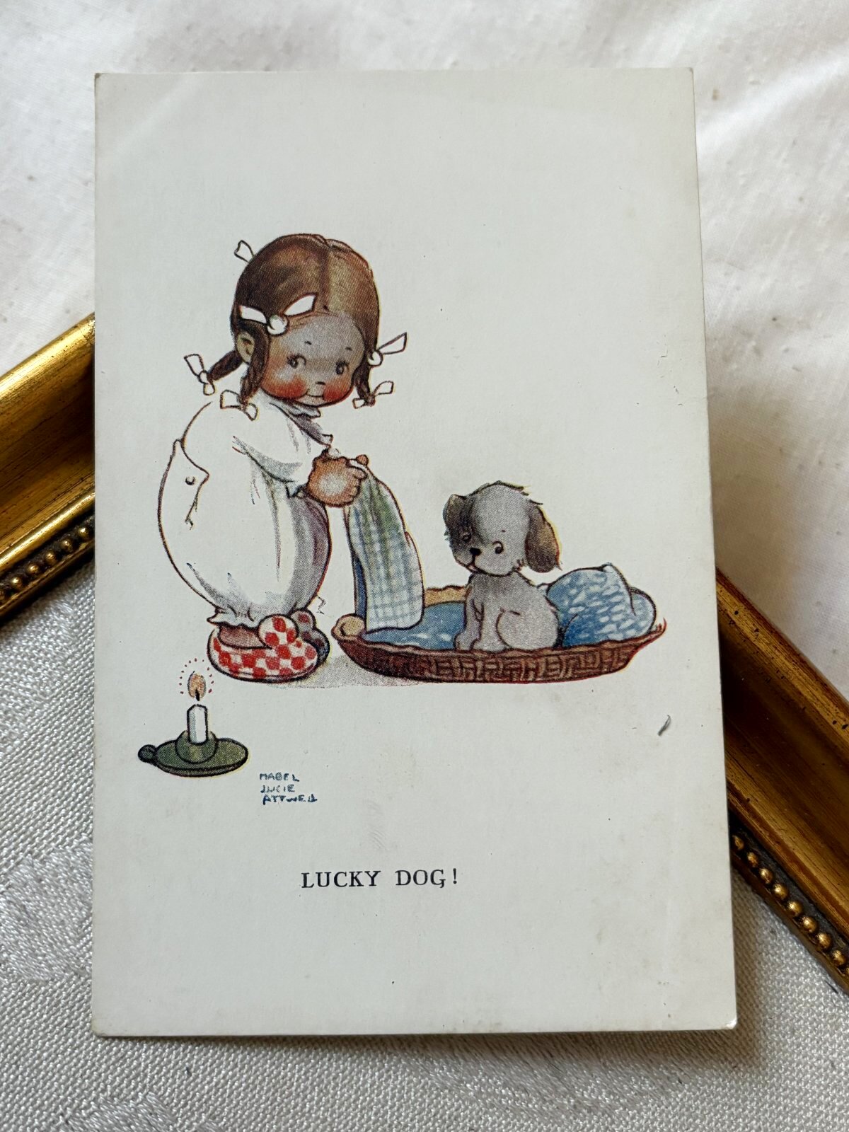 Postcard アンティークポストカード 犬のベッドのお世話をする女の子 A4604 Mabel Lucie Attwell (未使用)