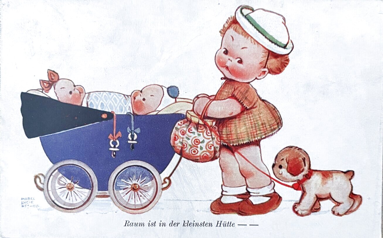 Postcard アンティークポストカード 双子の赤ちゃんの乳母車を押す女の子と犬 Mabel Lucie Attwell ドイツ1929年