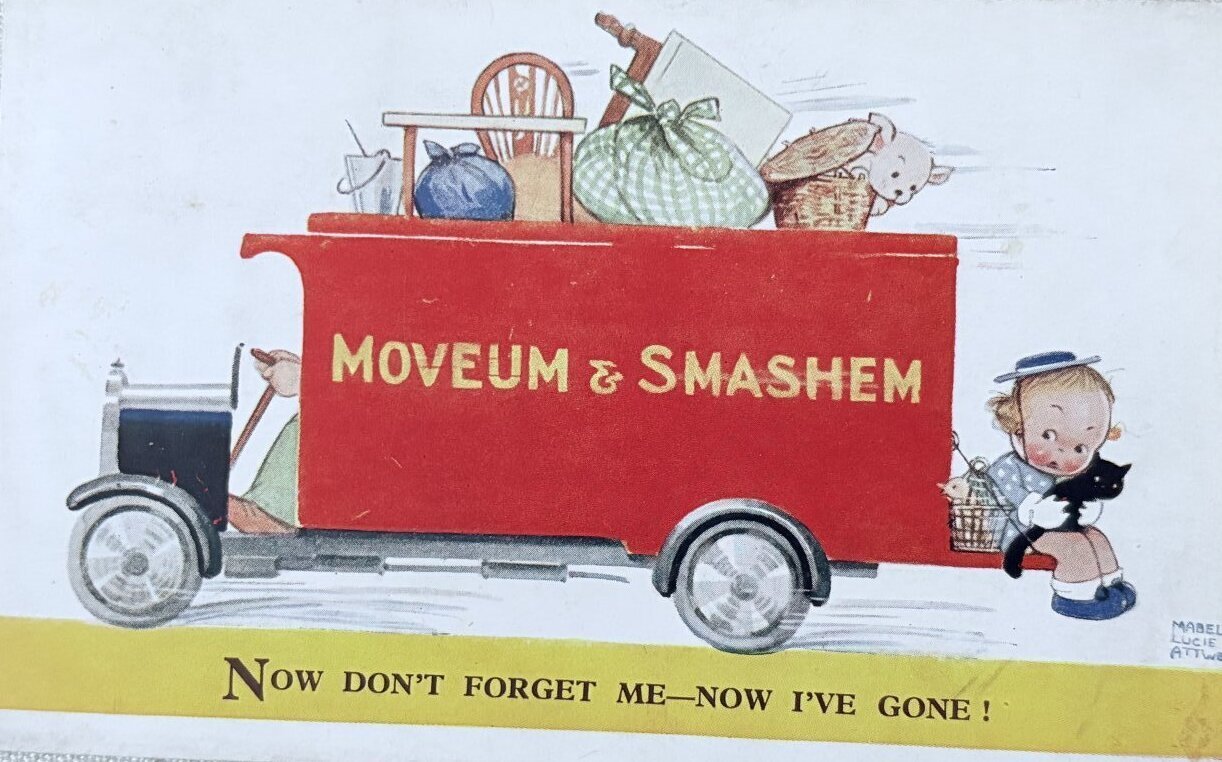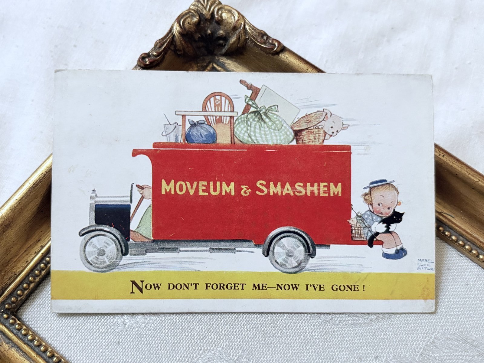 Postcard アンティークポストカード お引っ越しをする女の子と犬と黒猫 Mabel Lucie Attwell イギリス1934年