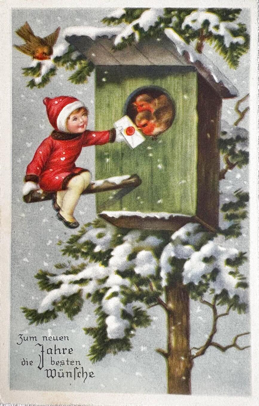 Postcard アンティークポストカード クリスマス 小鳥へ手紙を届ける子ども ロビン