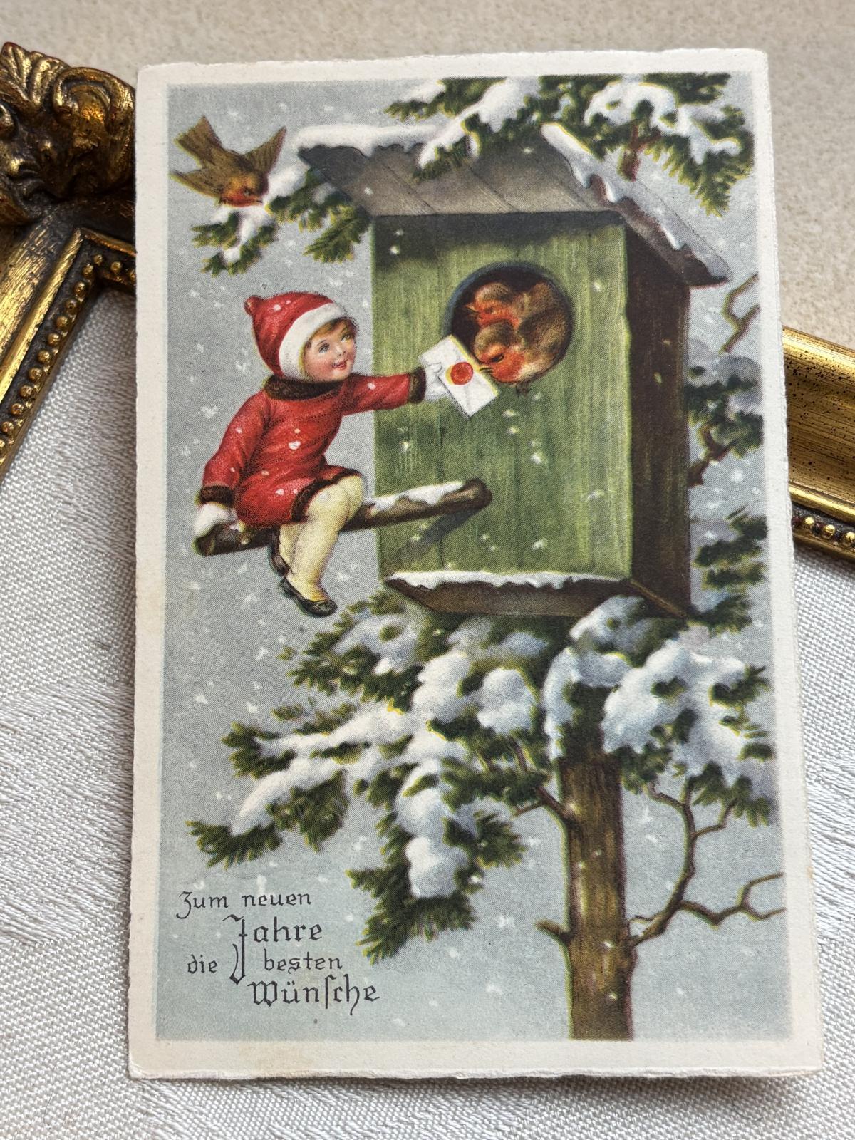 Postcard アンティークポストカード クリスマス 小鳥へ手紙を届ける子ども ロビン [g12150]