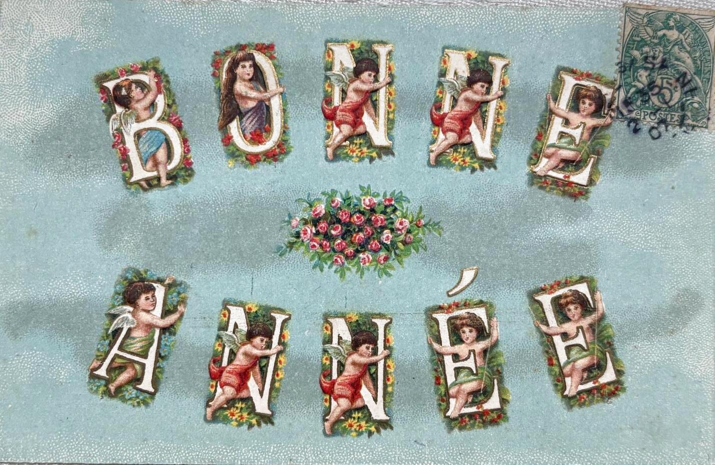 Postcard アンティークポストカード クリスマス 新年祝い BONNE ANNEE フランス 天使のアルファベット文字 1907年