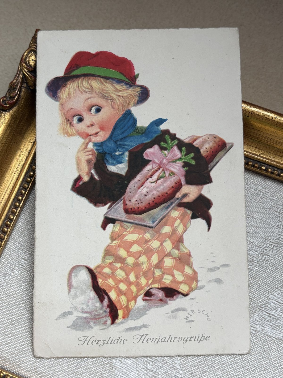 Postcard アンティークポストカード 新年祝い New Year プレゼントを運ぶ男の子 パン グーグリー ドイツ1920年